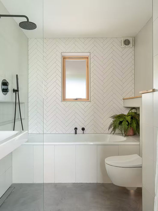 The family bathroom has double sinks, a separate shower and a deep steel bath, with an additional WC off the hallway. Heat recovery ventilation runs throughout the house.