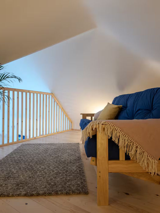 There are two bedrooms opening onto the covered veranda, one with a super king that can be set as twins, the other with a king bed. The mezzanine above the living space has a double futon.